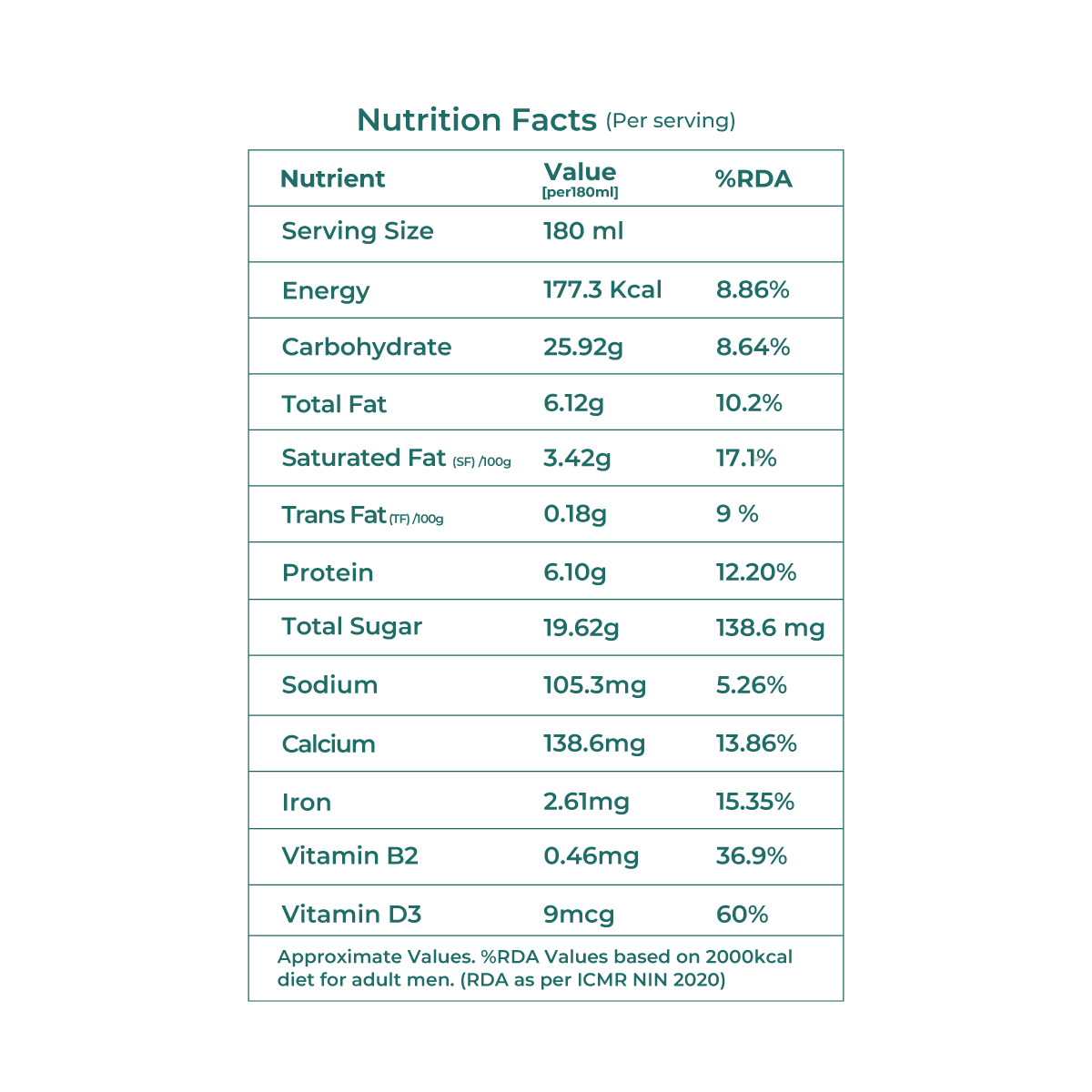 A perfectly balanced blend of creamy milk and aromatic vanilla essence — light, smooth, and irresistibly refreshing. Tailored to Indian taste buds, it’s the perfect feel-good drink for any time of day.
